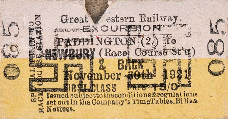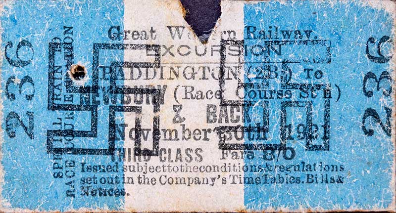 The two tickets shown here were issued in 1921 the year after Adolf Hitler’s Nazi party was formed and appropriated the swastika for the party flag. At that point in history the swastika (the word comes from Sanskrit) had not acquired the sinister symbolism which, in Europe at least, it retains to this day. In reality it has been in use for millennia and is a symbol of good luck and prosperity. For this reason it would seem that the GWR overprinted these tickets from Paddington to Newbury Racecourse in the hope that the holder would have a profitable day at the races.
