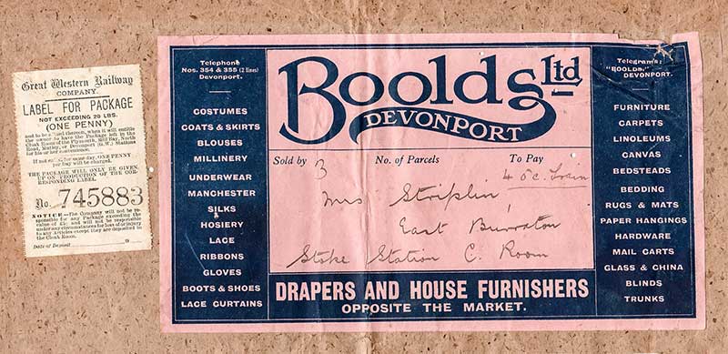 This simple, modest item certainly offers plenty of mystery. It seems to us that Boolds being such an important Plymouth retailer and Mrs Striplin an equally important customer, perhaps they arranged at her direction to send a young lad on a bicycle with the parcel to the GWR station, from where she or a servant maybe would retrieve it, and then send it on the 4 o’clock train on the Plymouth, Devonport and South Western Junction Railway to Stoke Climsland?