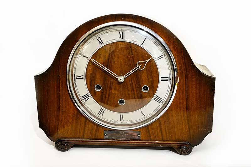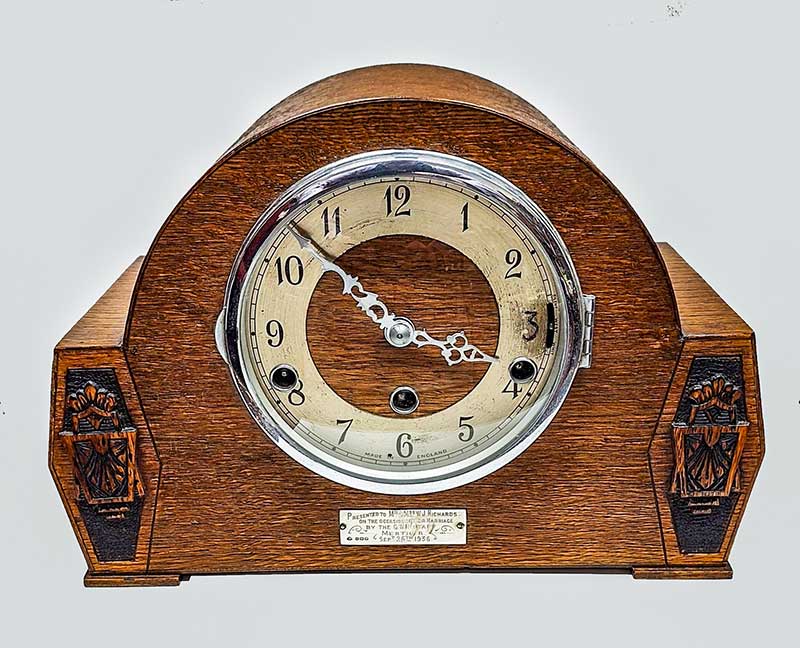 Proving that a clock was not just a retirement gift, this wonderful piece with art deco carved motifs and a movement by Norland was presented to Mr & Mrs W J Richards on the occasion of their marriage, by the GWR Staff at Merthyr on 26 September 1936. The engraved plate is hallmarked silver.